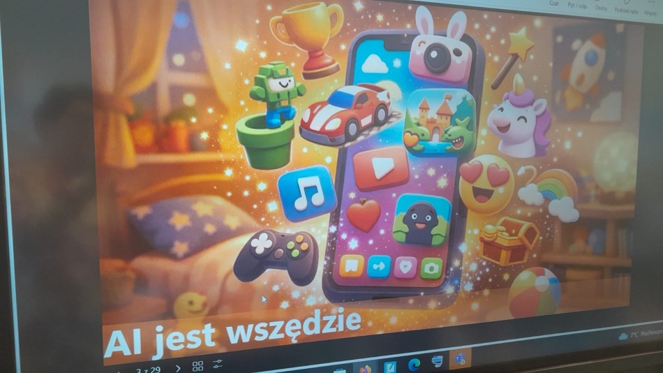 Zajęcia miały formę prezentacji wzbogaconej o przykłady oraz krótką dyskusję, podczas której uczniowie mogli podzielić się swoimi opiniami i doświadczeniami. Lekcja była interesująca i pozwoliła uczestnikom lepiej zrozumieć zarówno możliwości, jak i ograniczenia sztucznej inteligencji.