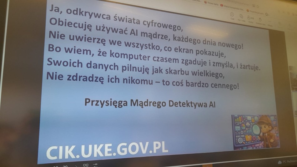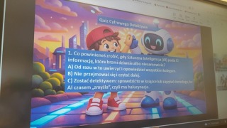 Podczas lekcji omówiono m.in. problem dezinformacji, błędnych odpowiedzi generowanych przez systemy AI, a także kwestie dotyczące prywatności i bezpieczeństwa danych. Uczniowie dowiedzieli się również, dlaczego nie należy bezkrytycznie ufać informacjom uzyskanym z narzędzi opartych na sztucznej inteligencji oraz w jaki sposób weryfikować ich wiarygodność.