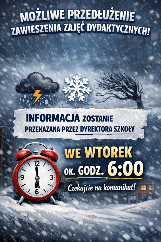 2026-01-26Informacja dotycząca zajęć w szkole 27 stycznia W przypadku utrzymania się niekorzystnych warunków atmosferycznych możliwe jest przedłużenie zawieszenia zajęć dydaktycznych na kolejny dzień. Informacja w tej sprawie zostanie przekazana przez dyrektora szkoły we wtorek około godz.6.00.